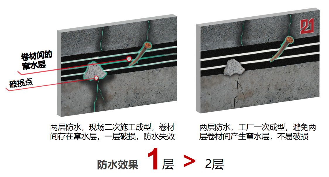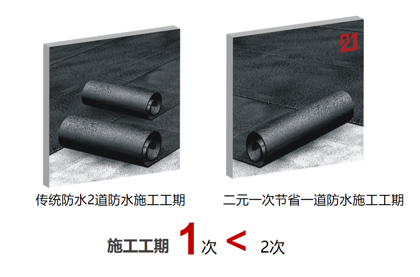 對比傳統(tǒng)材料,二元一次單層防水系統(tǒng)采用兩層卷材,工廠一次預(yù)制成型,在工地上直接進(jìn)行裝配施工,避免了現(xiàn)場二層卷材交叉施工,層間易竄水和底層卷材易破損的弊端。