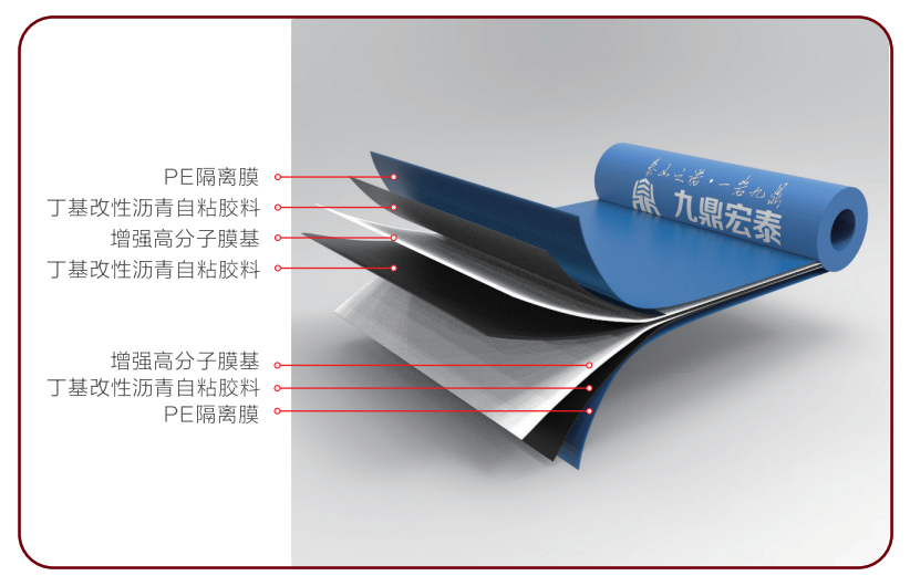 BG-2M丁基改性雙膜基防水卷材以雙道增強高分子膜為中間膜基,以丁基橡膠改性瀝青自粘膠料為粘結(jié)材料,并覆以隔離材料而組成的本體自粘防水卷材。