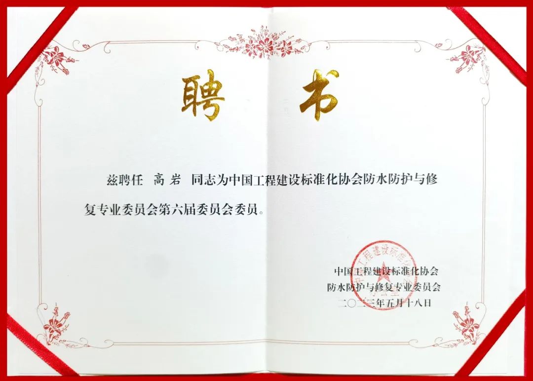 正是企業(yè)自身實力與自愈合技術(shù)的加持,遼寧九鼎宏泰防水科技有限公司董事長高巖被聘為中國工程建設(shè)標準化協(xié)會防水防護與修復(fù)專業(yè)委員會第六屆委員會委員。