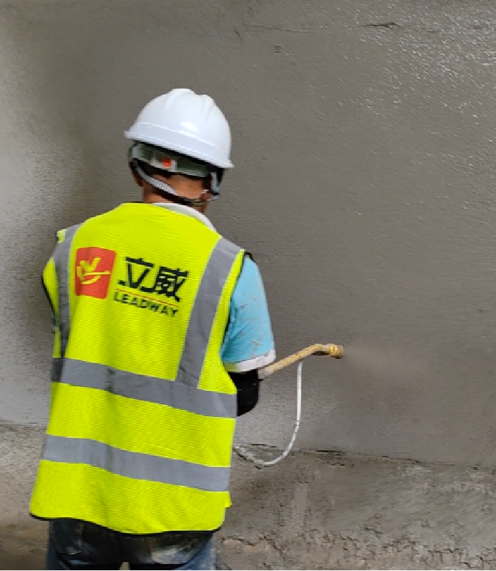 2)施工中:兌水?dāng)嚢钑r(shí),粉料與清水混合比例為:1:0.25~0.28(可根據(jù)自己需要的稀稠度加入清水),必須使用電動(dòng)攪拌器器充分?jǐn)嚢?3 分鐘以上,靜置 2 分鐘方可進(jìn)行涂刷使用,配好的混合料須在約1小時(shí)內(nèi)使用完畢。施工交叉刮涂2道,厚度1-2mm,用量2-4kg/㎡,施工完成后需養(yǎng)護(hù)2-3天。