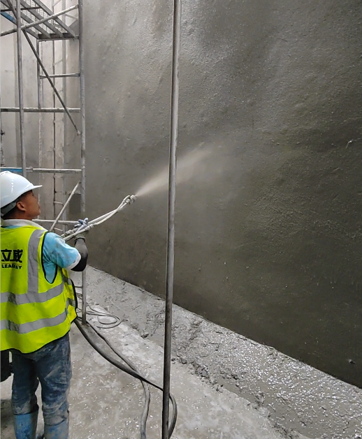 2)施工中:兌水?dāng)嚢钑r(shí),粉料與清水混合比例為:1:0.25~0.28(可根據(jù)自己需要的稀稠度加入清水),必須使用電動(dòng)攪拌器器充分?jǐn)嚢?3 分鐘以上,靜置 2 分鐘方可進(jìn)行涂刷使用,配好的混合料須在約1小時(shí)內(nèi)使用完畢。施工交叉刮涂2道,厚度1-2mm,用量2-4kg/㎡,施工完成后需養(yǎng)護(hù)2-3天。